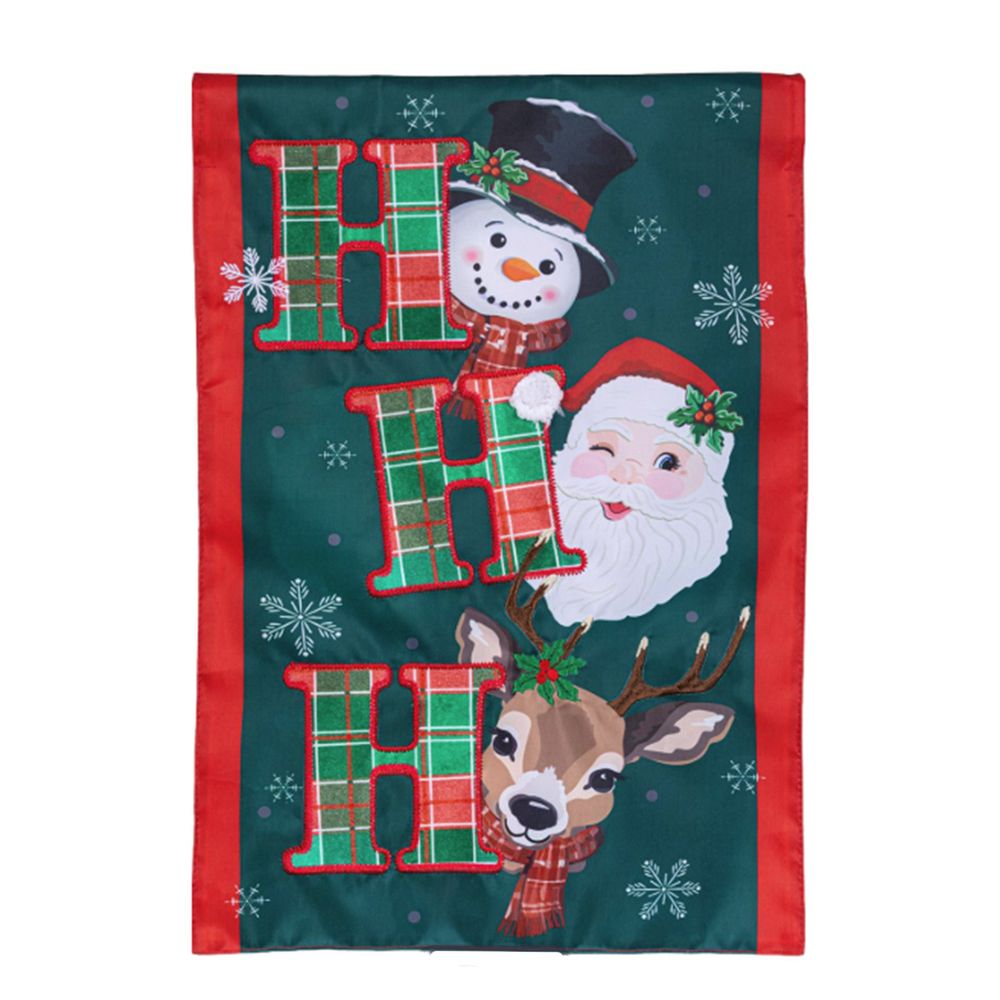 A snowman, Santa, and a friendly reindeer are wishing everyone a very happy Christmas on this Ho Ho Ho Christmas Icons Garden Flag.