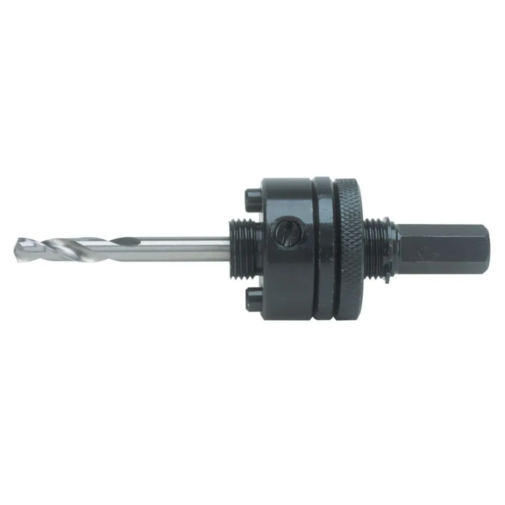 This Irwin® hole saw arbor with 3/8" hex shank fits 1 1/4"- 6" Irwin® Hole Saws. It has a removable pilot drill for easy replacement, and fits 3/8" and 1/2" drill chucks.