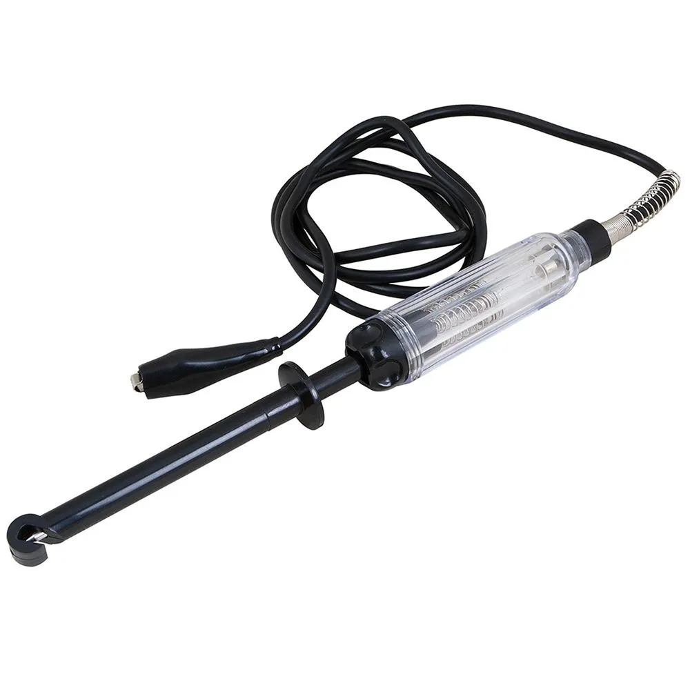 Molded hook on probe circuit tester allows testing in tight places or limited access. Made with a stainless steel probe that locks into wires keeping hands free for other things. It can be used on 6, 12, and 24 volts.