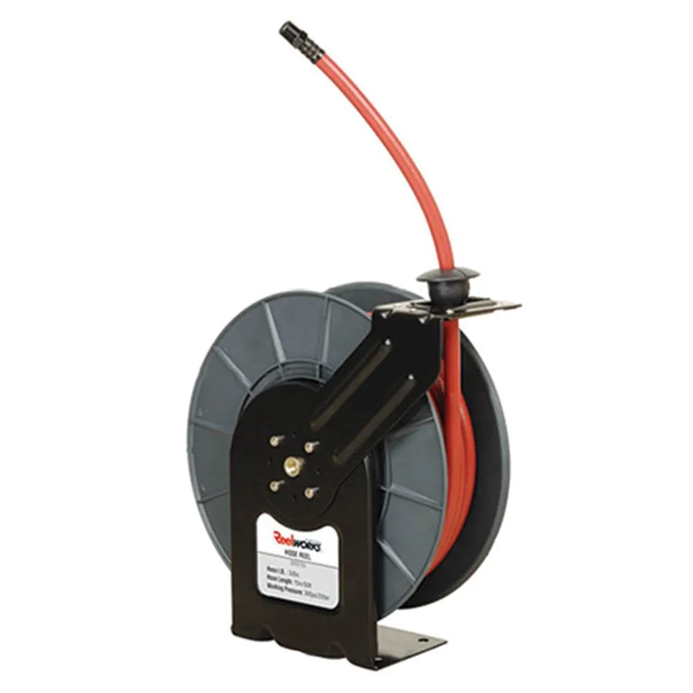By ReelWorks, this hose reel is designed for air and water applications. The base of the hose reel is designed for wall, ceiling and floor mounting. This hose reel comes with a 50 ft. 3/8 inch hybrid polymer hose.
