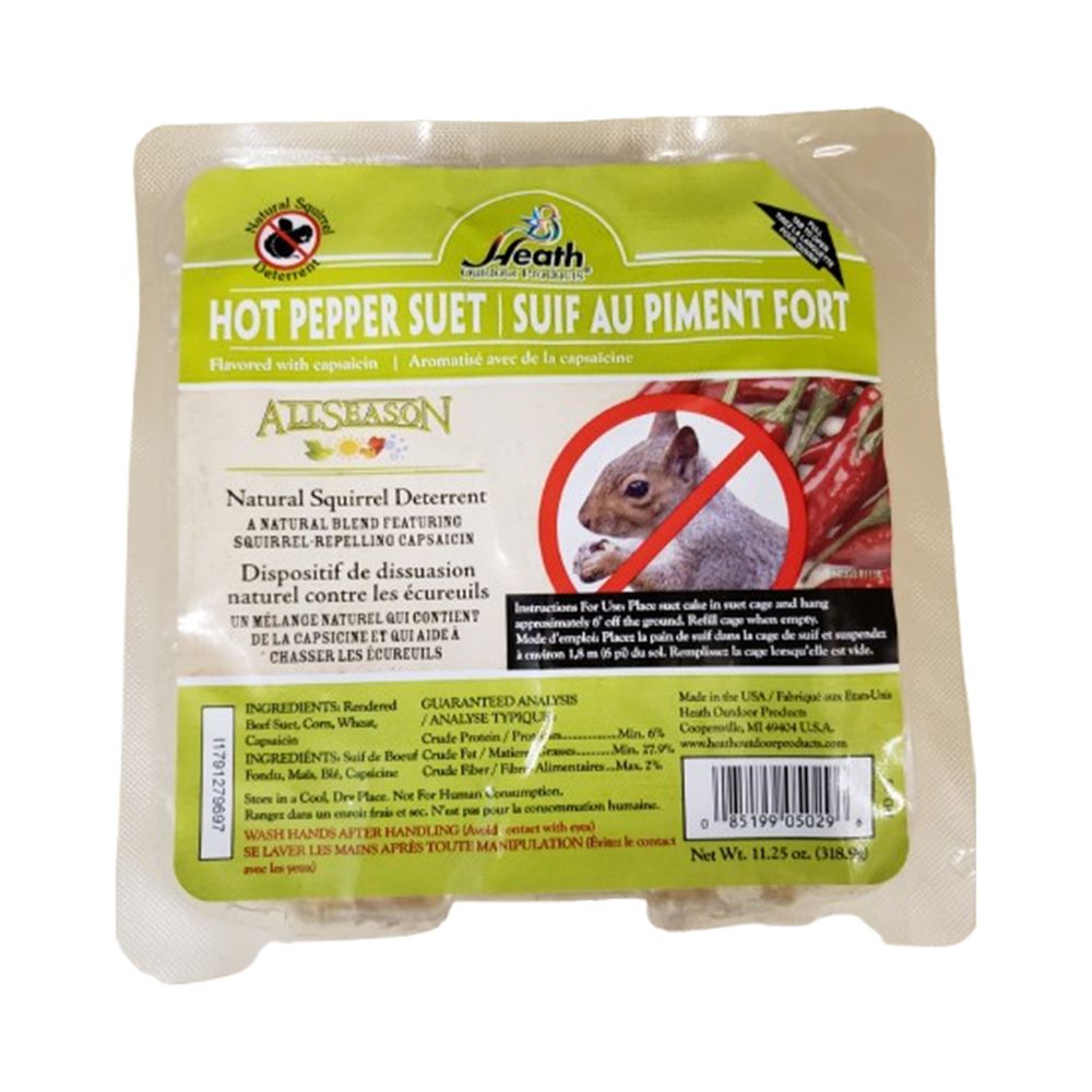 This all-season hot pepper suet contains corn, wheat, rendered beef suet and capsaicin. Capsaicin is the chemical in chili peppers that humans associate with the level of "heat". Squirrels are deterred from the capsaicin where birds are not. This special blend suet can attract cardinals, chickadees, goldfinches, thrushes, titmice, warblers and more.