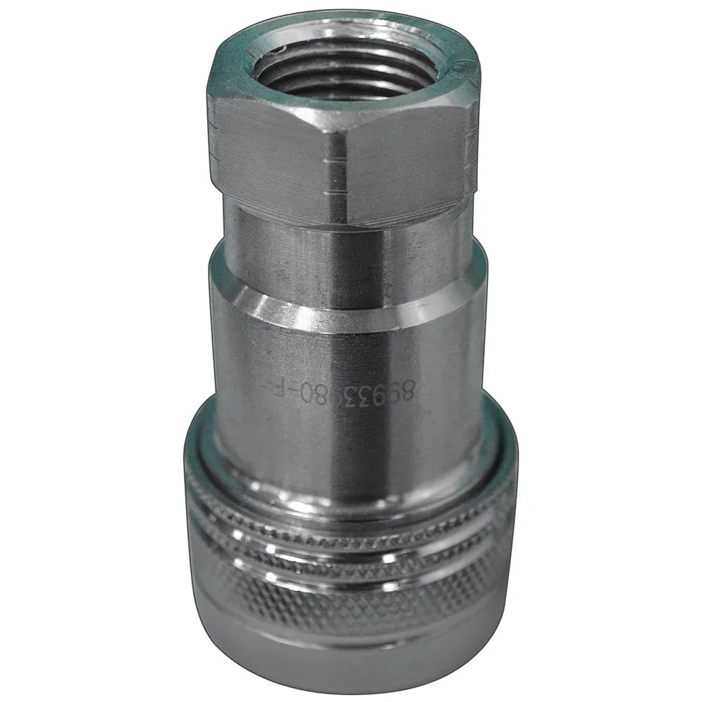 This agricultural hydraulic quick coupler has a working pressure of 3000 psi and a flow rate of 8 gpm. The quick coupler has a 1/2 in. - 14 NPFT thread and female ball valve.