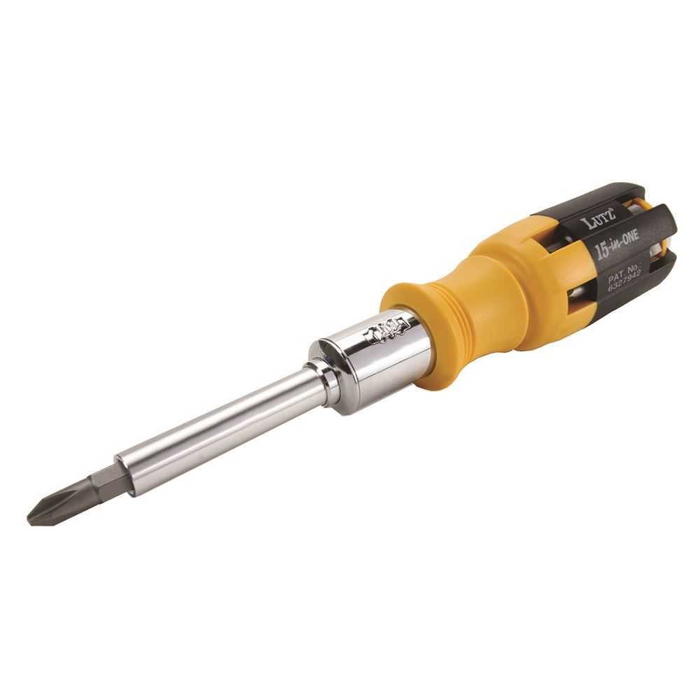 This 15 in 1 Yellow Ratchet Screwdriver gives you 15 drivers in one handy tool. The built-in storage chamber holds the following bits T15 and TT20 Torx bits, #0, #2, and #3 Phillips, 5/32, 1/8, 3/16, 1/4 in slotted, #1, #2 square drive.