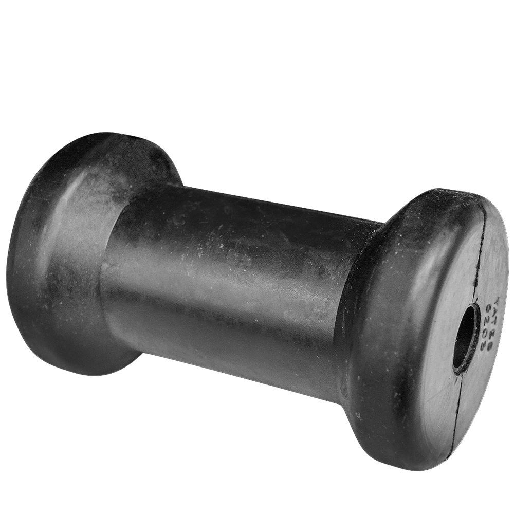 Durable black rubber keel roller measures 5" long x 3" width with a 5/8" diameter shaft. Constructed with a plastic sleeve insert for longer wear resistance.