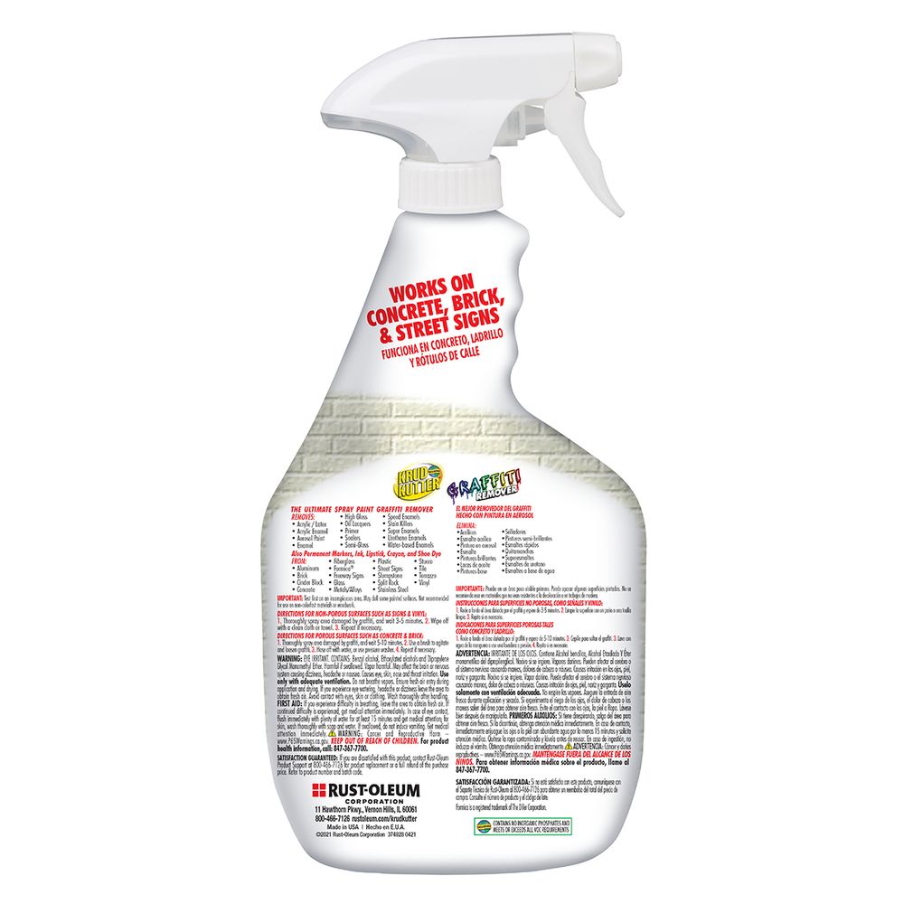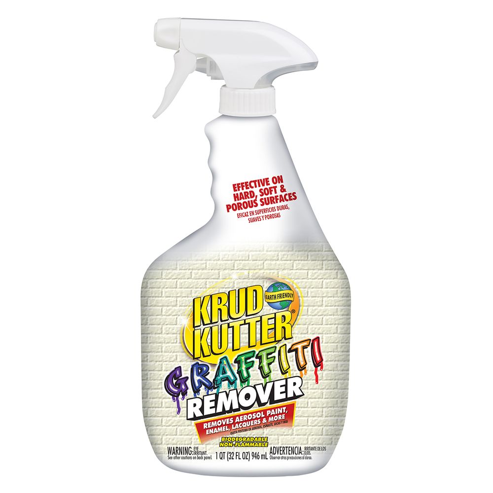 This bottle of Krud Kutter Graffiti remover is a quart-sized bottle with a trigger sprayer for easy application and helps to remove graffiti caused by spray paint, markers, and other materials from surfaces.