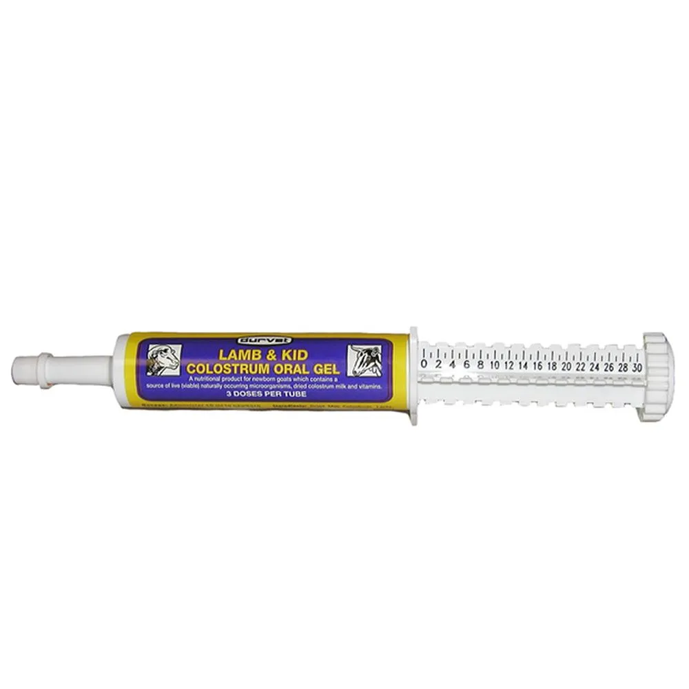 Containing dried colostrum milk and vitamins this tube of Lamb & Kid Colostrum Oral Gel is a natural supplement for newborn sheep and goats. INGREDIENTS: Dried Bovine Colostrum, Lactobacillus acidophilus fermentation product dehydrated, Lactobacillus casei fermentation product dehydrated, Bifidobacterium thermophilum fermentation product dehydrated, Enterococcus faecium fermentation product dehydrated, Vitamin A supplement, Vitamin D3 supplement, Vitamin E supplement, Vitamin B12 supplement, FD & C yellow No. 5, Vegetable oil, Polysorbate 80, Mono and Diglycerides.