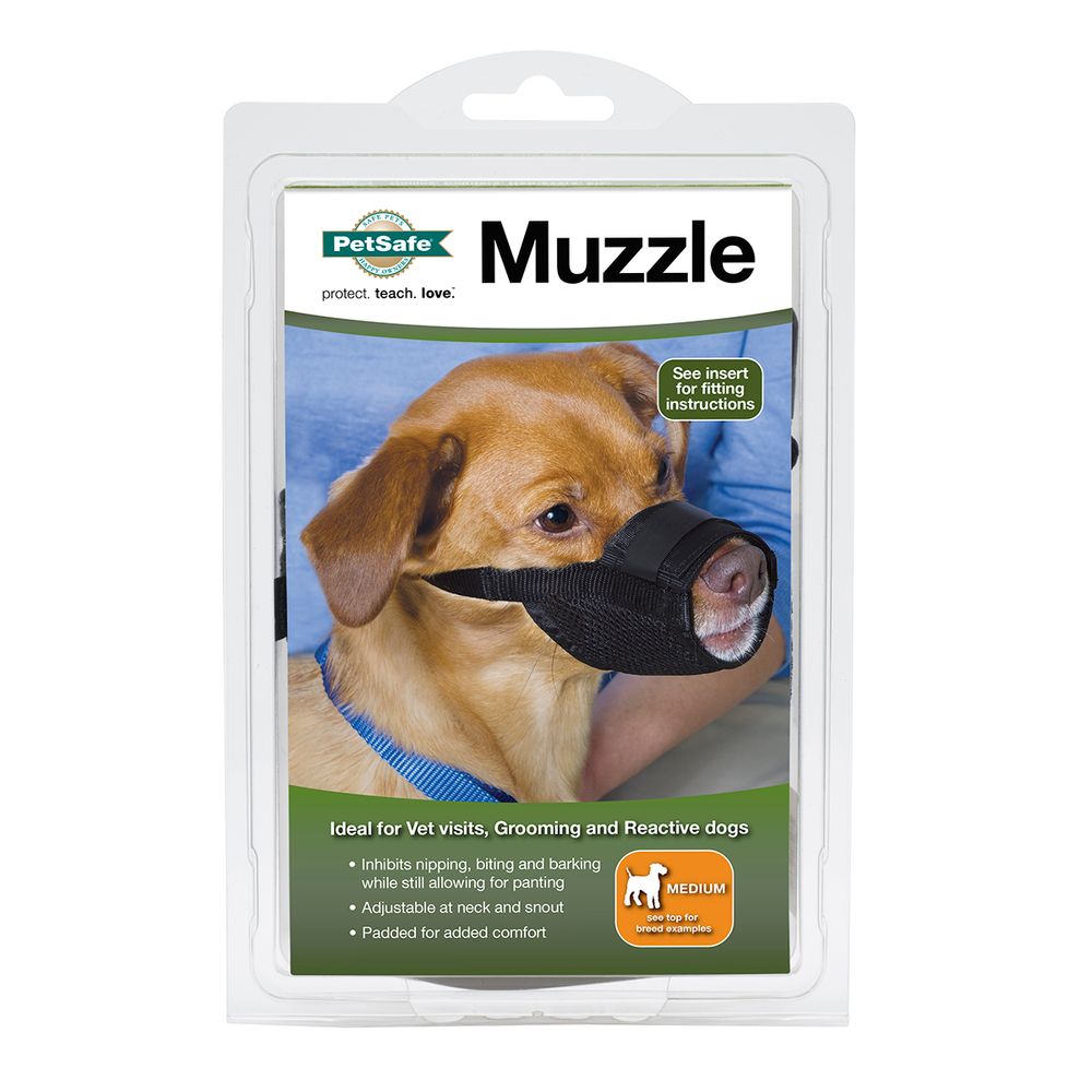 Are you looking for a way to train your dog on visits to the vet, groomer, or places that can be scary or overwhelming for your dog? This muzzle safely prevents dogs from nipping, biting, and barking while still allowing them to pant. The extra padding will keep your dog comfortable, and the fully adjustable snout and neck strap allows for a perfect fit.