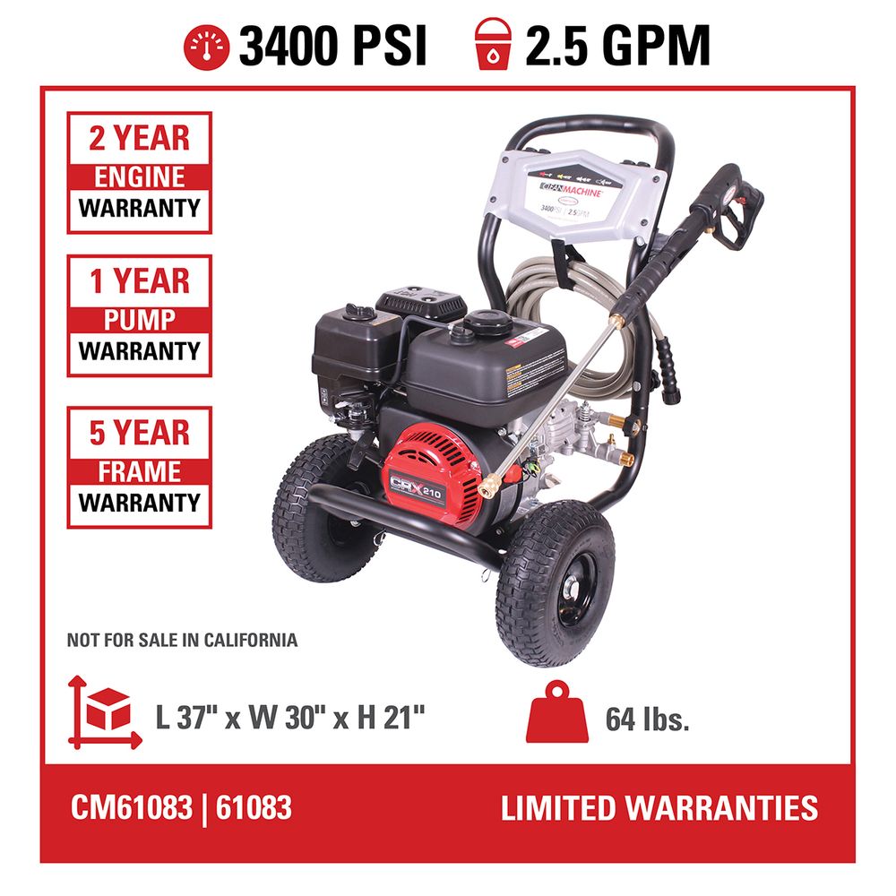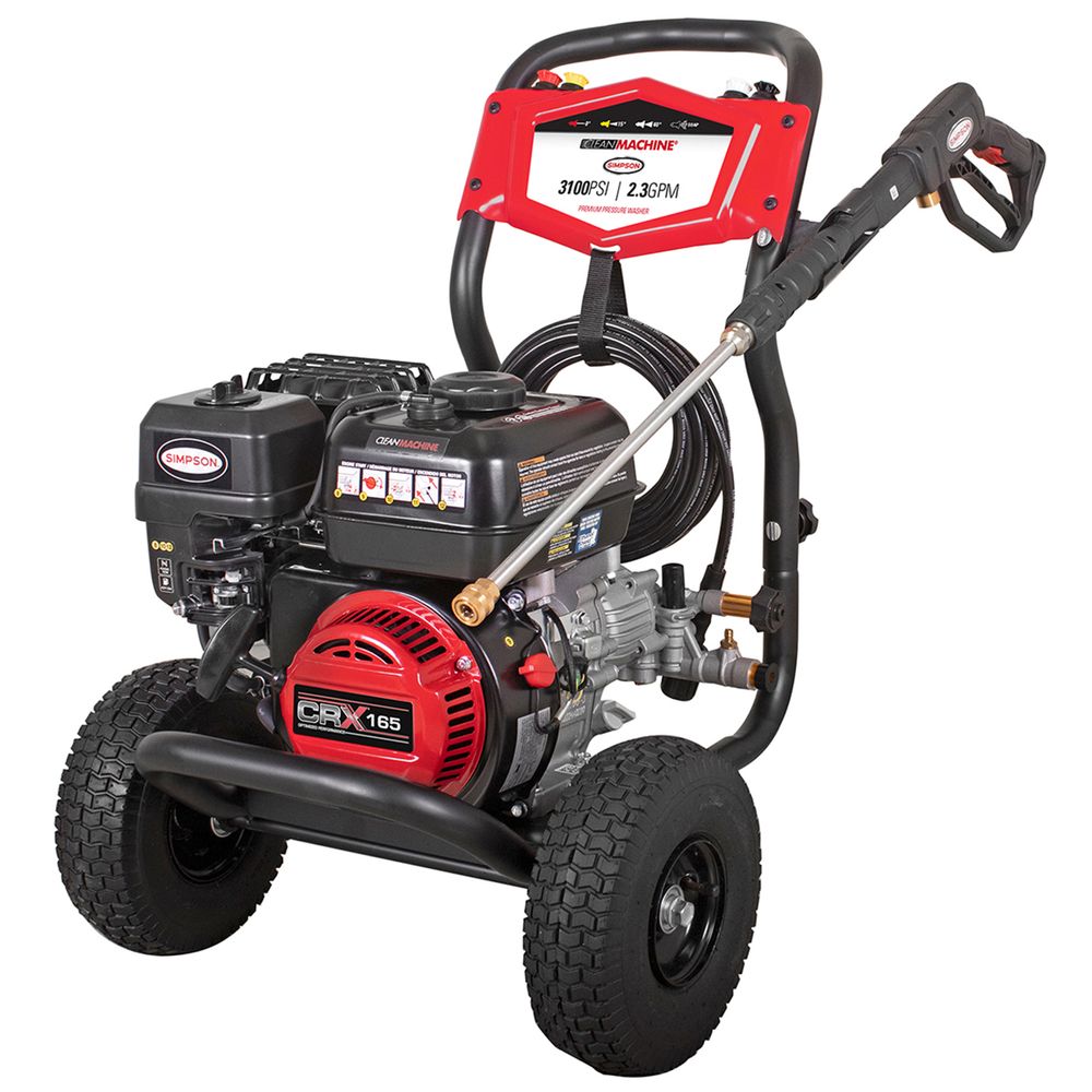 Clean big with the Clean Machine® by SIMPSON®! This fully assembled compact gas pressure washer is lightweight, easy to store, and provides a powerful pressure washing experience. Just set up and you are ready to clean. The Clean Machine features a (49-State compliant) CRX® engine paired with an OEM Technologies™ axial cam pump. This compact gas-pressure washer will allow easy access to hard-to-clean areas