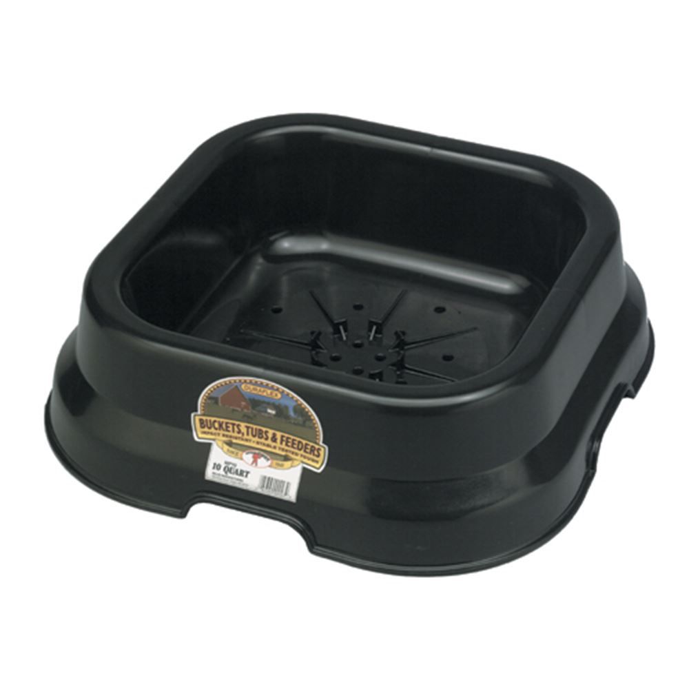 Great choice for those who want to save money by keeping salt and mineral blocks off the ground. The pan has ribs and drain holes in the bottom to keep air circulating and the feed or mineral block off the ground. Constructed of high impact plastic for years of use around the farm. Will accommodate a standard 50 lb. mineral block or 10 quarts of dry material. This pan will not hold water.