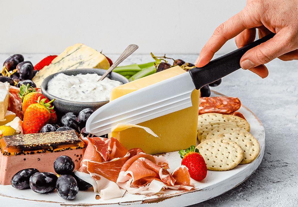The Knibble Lite is a non-stick cheese knife that cuts, spreads, and forks the serve your nibbles.