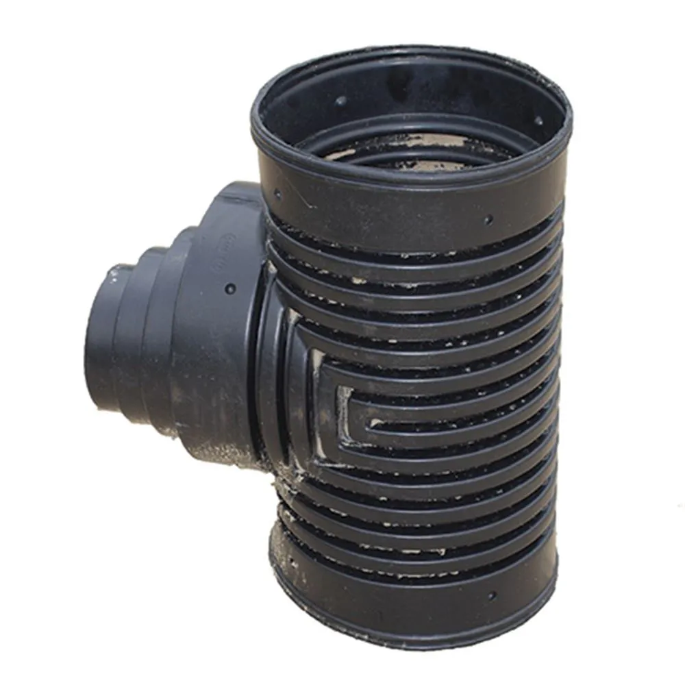 This tee is used to connect an 8" main run of corrugated pipe to a 4, 5, 6, or 8 inch piece of corrugated drain pipe. It requires no extra hardware to connect corrugated drain pipe. It has tabs that snap onto the ridges of the corrugated pipe.