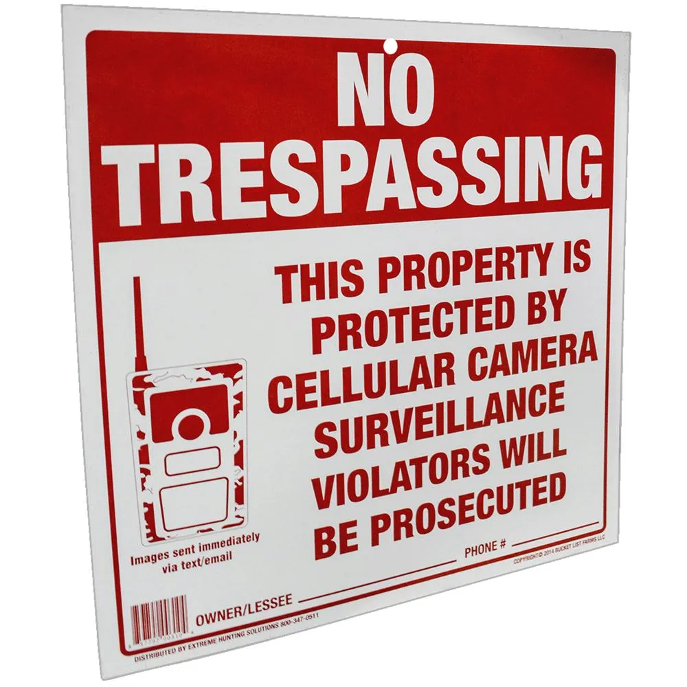 This Surveillance sign reads in all capital letters, "No Trespassing, This property is protected by cellular camera surveillance violators will be prosecuted." To the left of the text is an image of an electronic device with small text that reads "Images sent immediately via text/email." There is a sign for the owner or lessee to add their information and phone number. This sign measures 11-1/4 in. L x 11-1/4 in. W, it is constructed from plastic and is durable to be outdoors in rain and snow. Hang this no trespassing sign by the nail hole at the top. The vibrant red and white sign it sure to warn unwanted company.