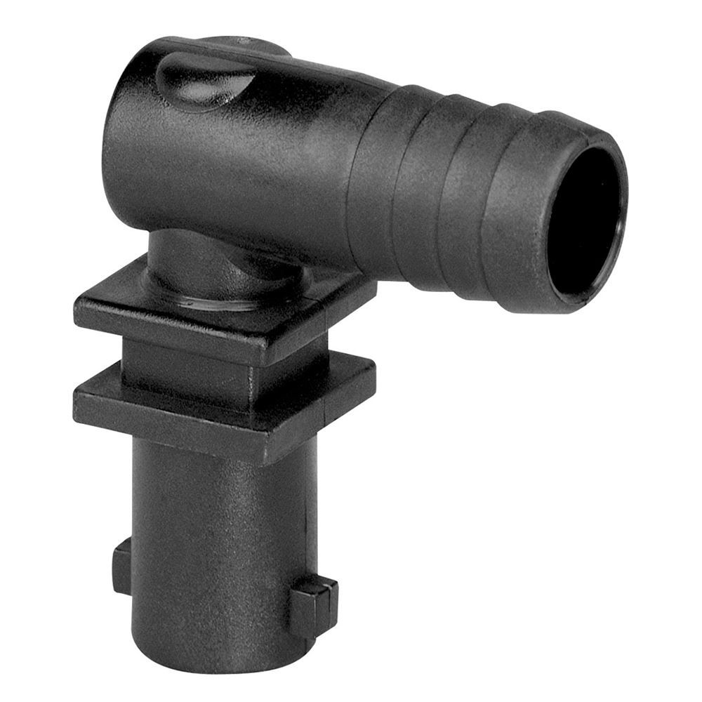 This Green Leaf 3/8-inch quick outlet nozzle body elbow can be used in agricultural spraying systems, particularly for boom sprayers, and is made from nylon.
