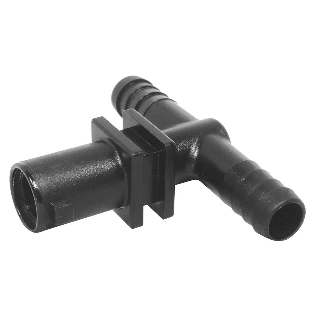 This Green Leaf 1/2-inch quick outlet nozzle body tee can be used in agricultural spraying systems, particularly for boom sprayers, and is made from nylon.