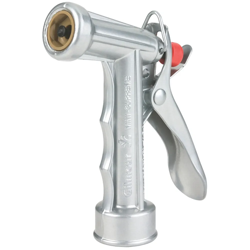 Mid-size, heavy-duty, zinc-metallized body. Poly valve assembly with fixed nut. Hold open clip for continuous spraying. Self-adjusting for lifetime leak-free seal.