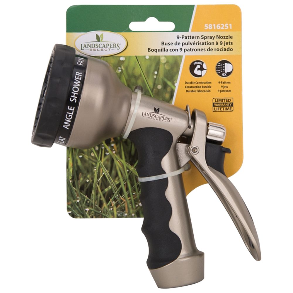This nine-patterned nozzle with comfortable grip handles has a locking clip that allows continuous water flow. It also features an adjusting stem for an increase or decrease in flow.