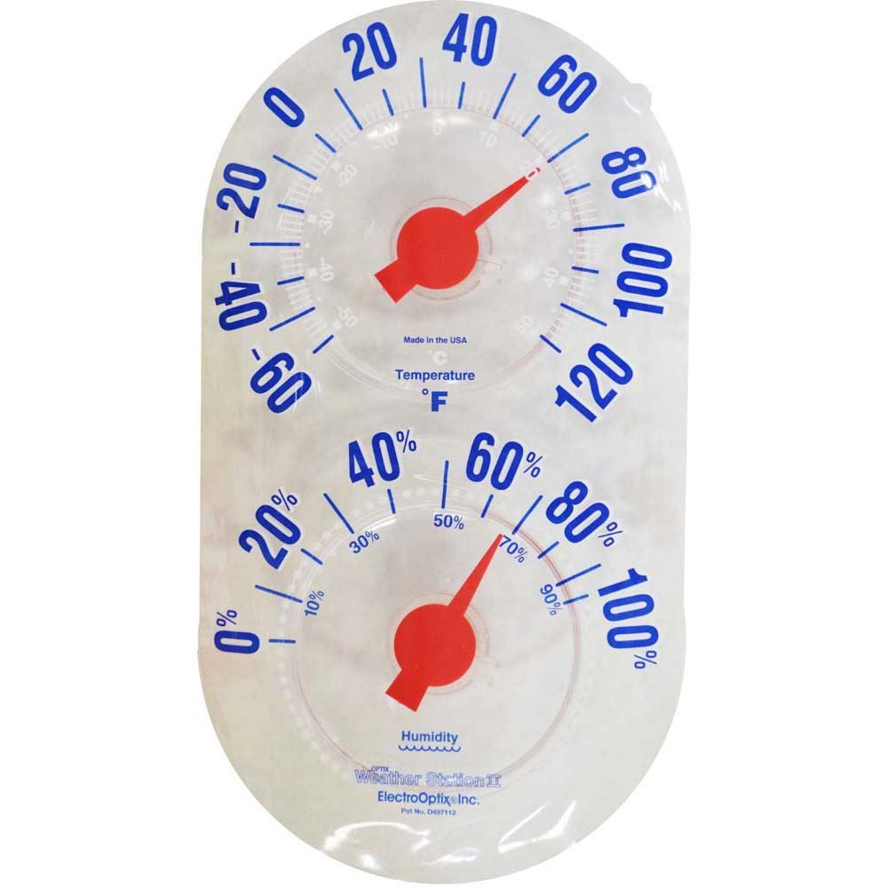 Clear, flexible and virtually transparent thermometer/hygrometer (temperature/humidity) instrument adheres firmly to windows or glass doors using electro-static technology