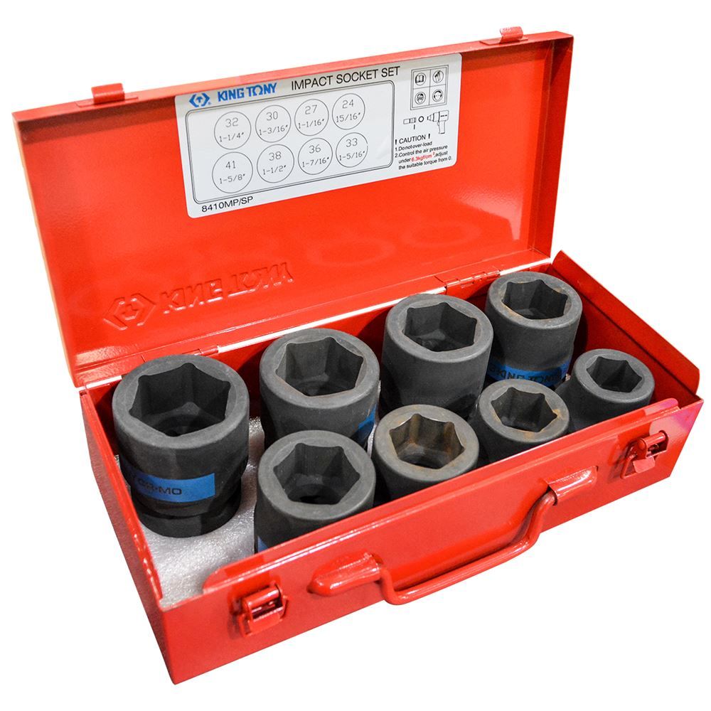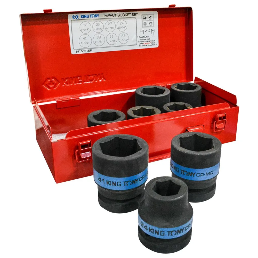This 1 inch drive 8 piece metric impact socket set by King Tony is professional grade. This metric socket set is constructed with a heavy duty chrome molybdenum alloy steel and phosphate sunk finish,