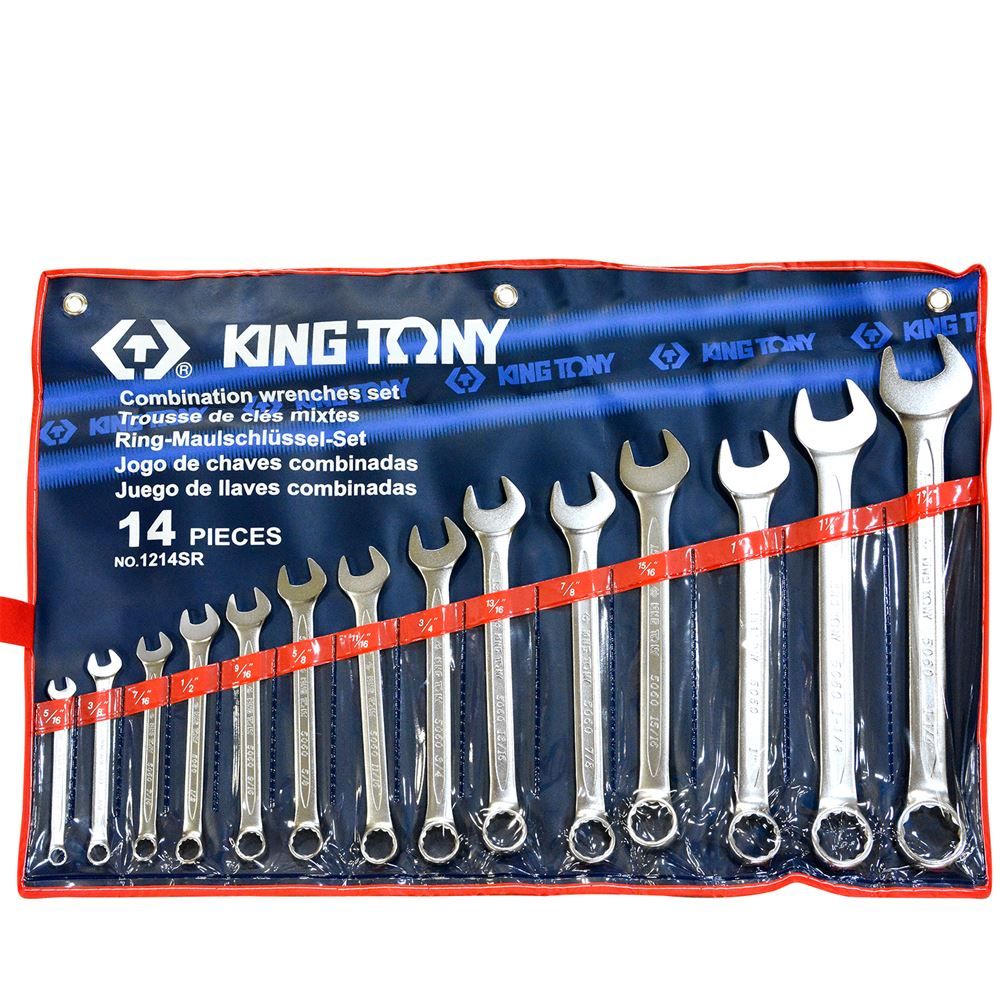 This 14-piece King Tony® combination wrench set could be used to tighten or loosen nuts and bolts with hexagonal (six-sided) heads within that size range.