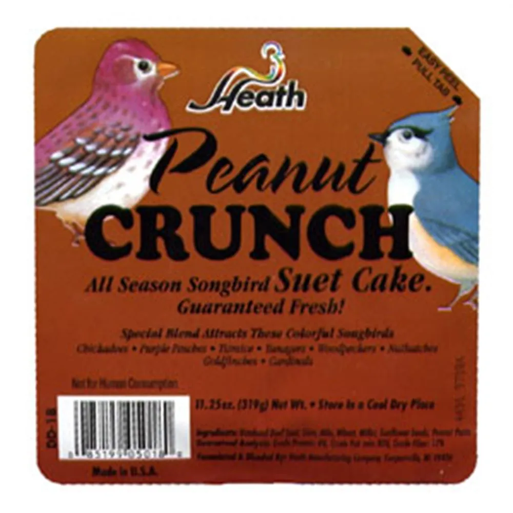 The irresistible taste of peanuts attracts a variety of animals, including wild birds. Created by Heath Outdoor Products®, the Peanut Crunch suet cake offers the well known taste of peanuts to songbirds. Available year-round, the cake is filled with peanut parts, sunflower seeds, corn, and millet for the birds to consume. It will attract cardinals, finches, wrens, and much more.
