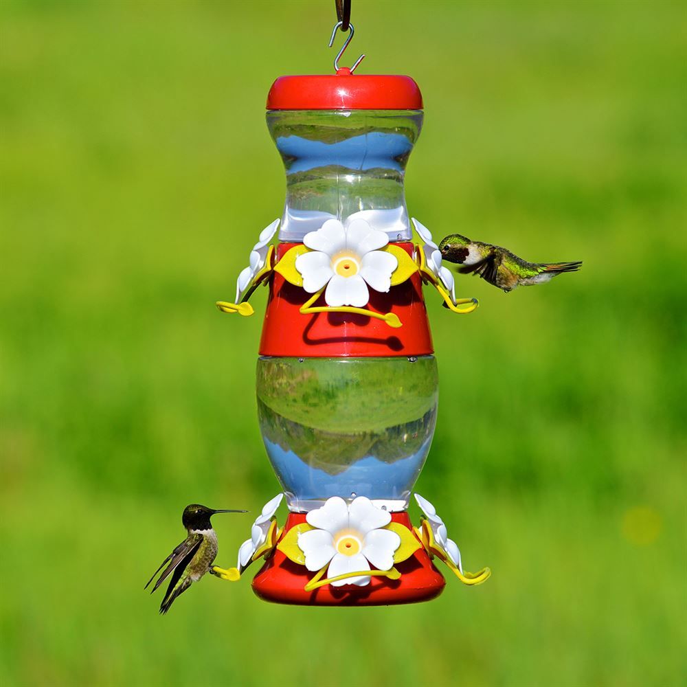 This Double Decker Plastic Hummingbird Feeder has four feeding ports on each feeder. Combined, that�™s eight feeding ports in all. The vibrant red accents, flower-shaped ports and comfortable vine-style perches are perfect for attracting hummingbirds.