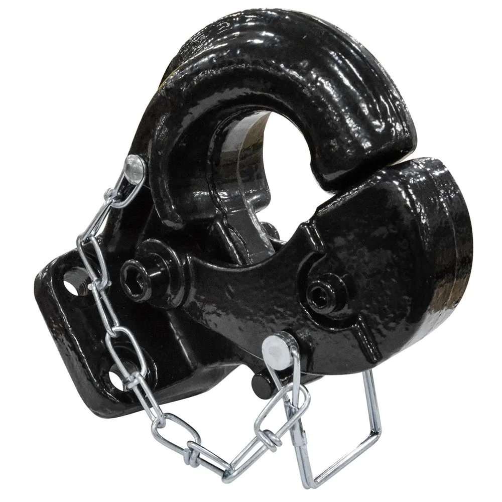 Constructed from alloy steel then continued through a drop forging process to shape the steel accordingly, this 20 ton pintle hook has excellent strength. In addition to pulling a horizontal capacity of 20 tons, it can perform a vertical load lift of up to 8,000 lbs. The adjustable receiver can have an inner diameter from 2 to 3 inches, and supports a tow ring diameter of 1-1/4 to 1-5/8 inches. It features a locking arm and bolted chain for more protection when in use, this pintle hook hitch is also powder coated for further durability.
