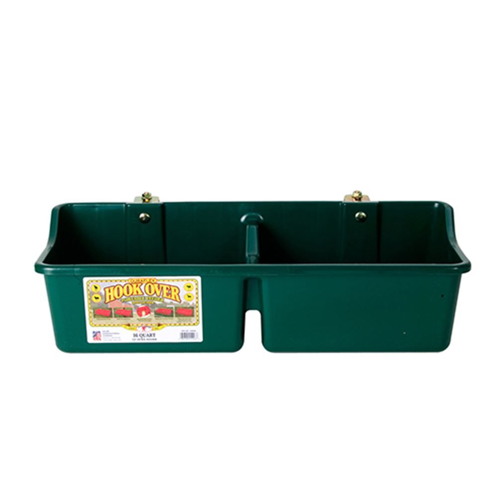 This Hook Over Portable Feeder has a built-in divider for simultaneous feeding of two animals, or for separating pellets, feed, and supplements. Made of farm-tough, high-density polyethylene for superior strength. Built-in heavy-duty steel brackets are adjustable from 1/4 inch to 2.25, allowing the feeder to hang on wire, pipe, or board fences. Brackets include eyelets for permanent mounting if desired (permanent mounting hardware not included). Ideal for horses, goats, sheep, alpacas, and llamas. Measures 24 inches long by 9.75 inches wide by 7 inches high. Each section holds 8 quarts (2 gallons); the total feeder capacity is 16 quarts (4 gallons).