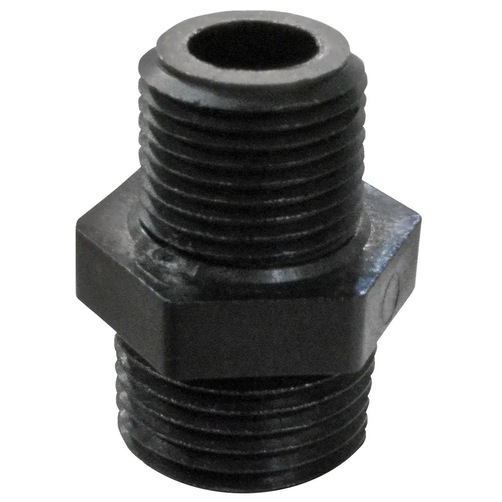 A reducer pipe nipple can connect with two fittings at once on a variety of Fimco sprayers. The construction of this hardware piece is a durable polypropylene. There is a central hexagonal shape on this pipe nipple, with dual male ends that extend from this central location. Both of these ends are threaded to provide a secured fit with its fastener. These male pipe nipple sizes do not have exact lengths. The first NPT length measures 1/2 inch in length and second NPT length measures 3/8 inch in length.