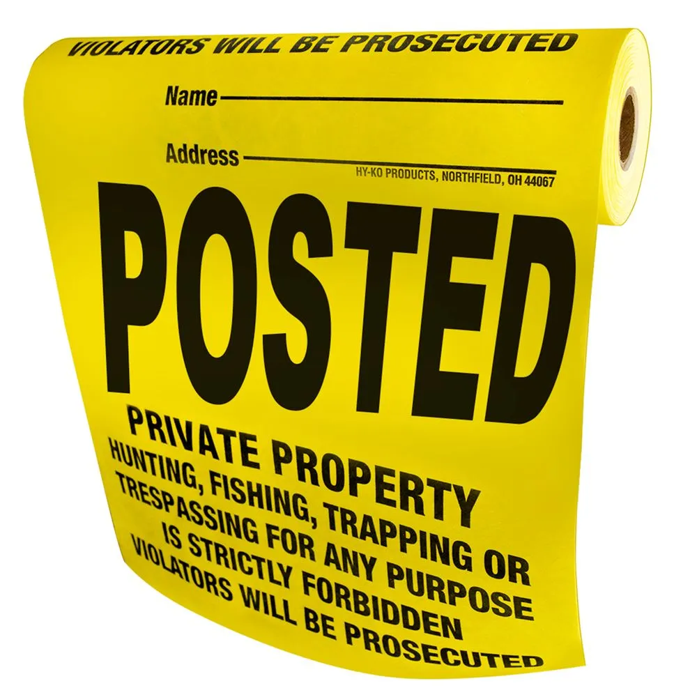 With 100 trespassing signs to a roll, you can protect your property from unwanted actions from trespassers. The posted property signs read, "Hunting, fishing, trapping, or trespassing for any purpose is strictly forbidden. Violators will be prosecuted."