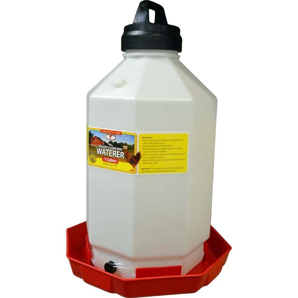 This 7 gallon Automatic Poultry Waterer features a vacuum-sealing O-ring cap that creates an automatic water flow. Constructed of dent-proof, heavy-duty translucent plastic that allows you to see the water level. The easy-to-fill jar snaps tightly onto the base, and the robust handle makes transport around the yard a breeze. This is a heavy-duty unit that will stand up to plenty of use. 16 inch diameter octagon by 24 inches high, holds 7 gallons.