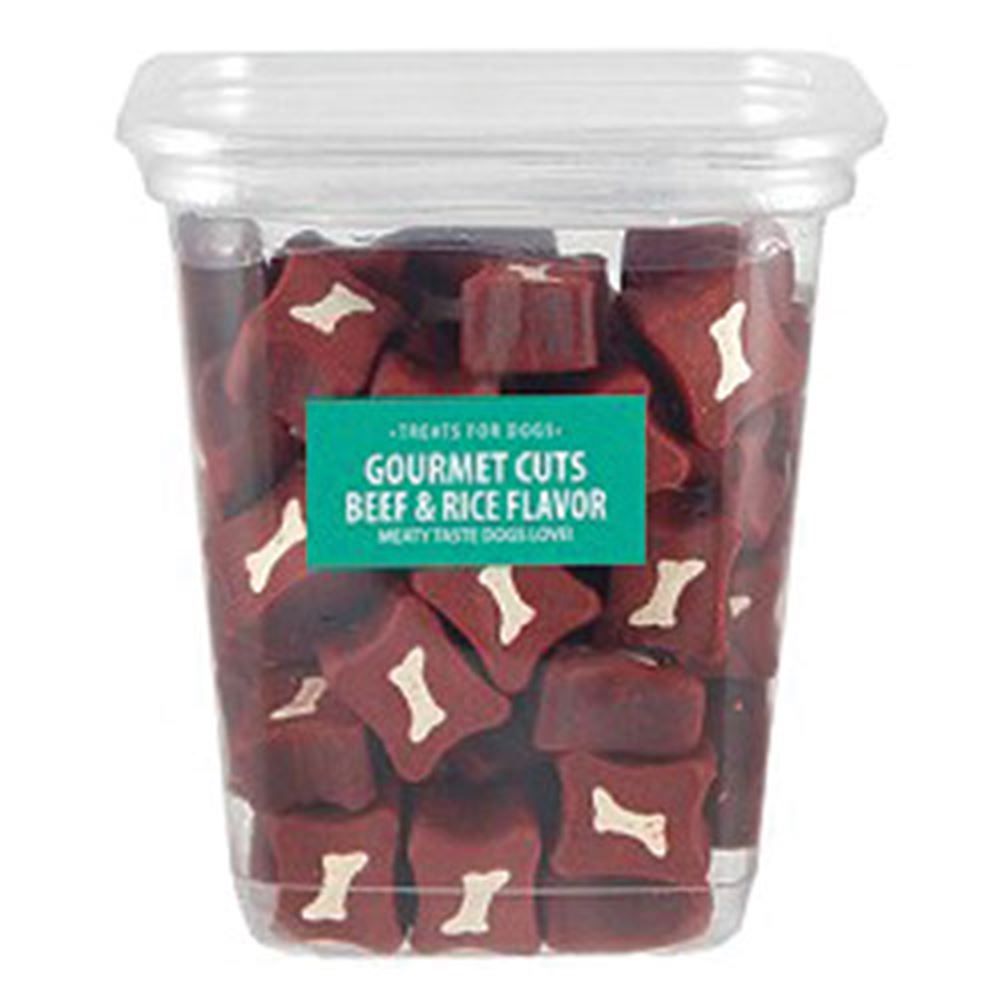 Shaped like a small bone, this beef and rice flavor dog treat is made with real beef. The treat is soft and moist. This is a 20 ounce package of dog treats.