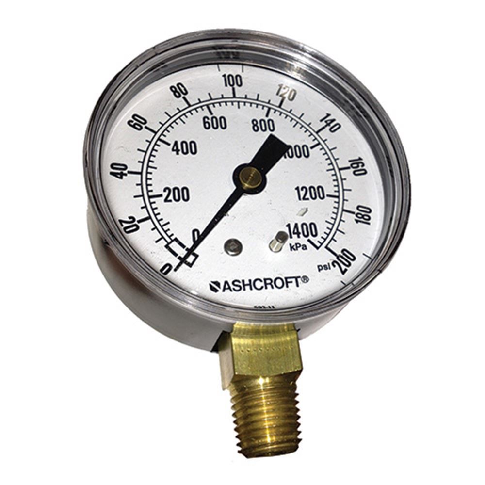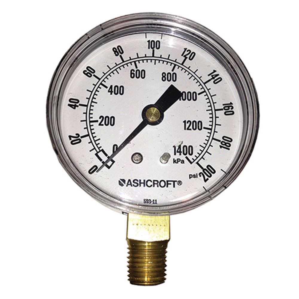 This 2 1/2" x 200 PSI dry pressure gauge is the replacement gauge for the Texas Remcor Model Con.2480.3 - three solenoid control valve. (ASC 40297) It has 1/4' NPT male threads.