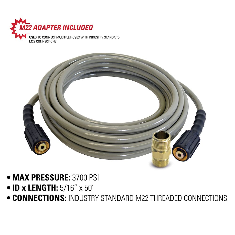 This quality pressure washer hose is built with industry-standard M22 female connectors on each end. The durable construction ensures a longer life.
