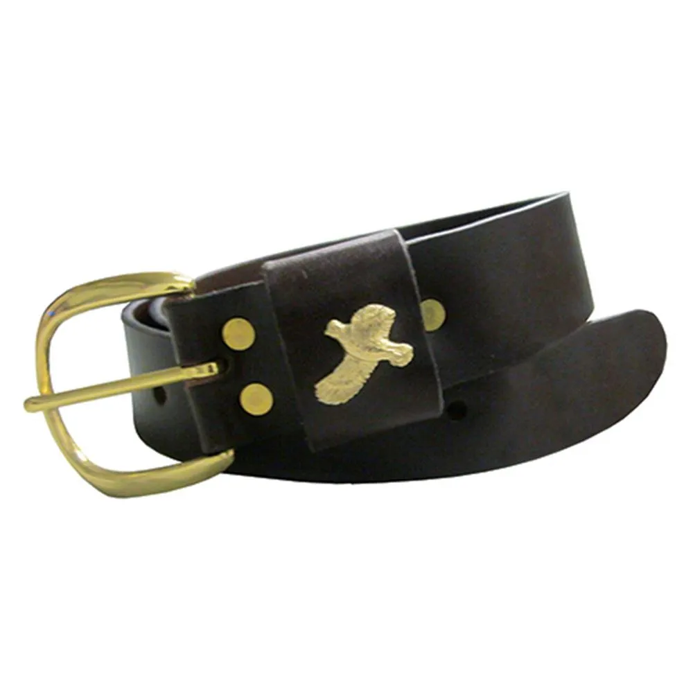 Made from tanned leather, this belt is a wonderful finishing touch to any bird hunter's outfit. It includes a brass buckle and a brass ornament of a flying quail on the keeper.