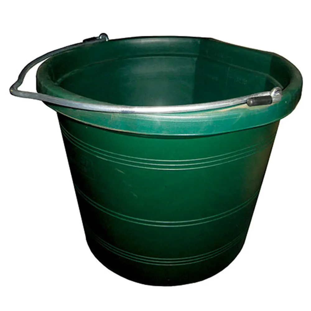 20 Quart Green Flat Back Heavy Duty Bucket, This Tuff Stuff Flat Back Bucket is made from a heavy duty impact resistant plastic that is very durable. It is heat and cold resistant which makes it flexible and strong. It is UV resistant so it can withstand years of outdoor exposure. The plastic is chemically neutral so it can hold fertilizers, oil solvents, animal feeds and many more products without breaking down. It can hold heavy materials and will not rust. It has smooth edges making it safe for animals and easy handling by people. It comes with a 5 year warranty (against normal use and wear). The dimension of this bucket is 15" wide x 11" high.