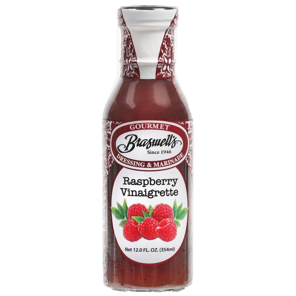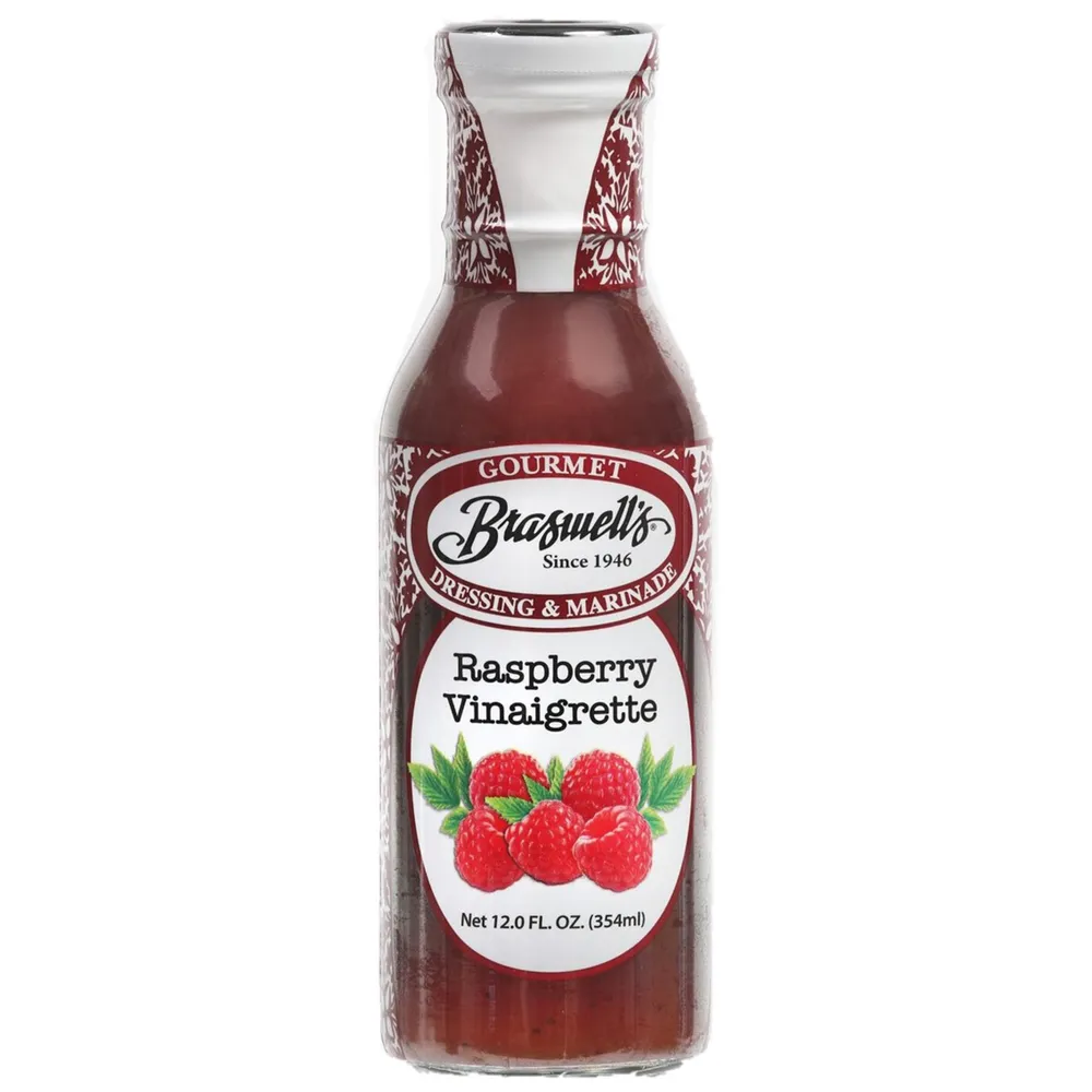 This 12-ounce bottle of Braswell's Raspberry Vinaigrette has a balance of sweetness from the raspberries and tanginess from the vinegar.