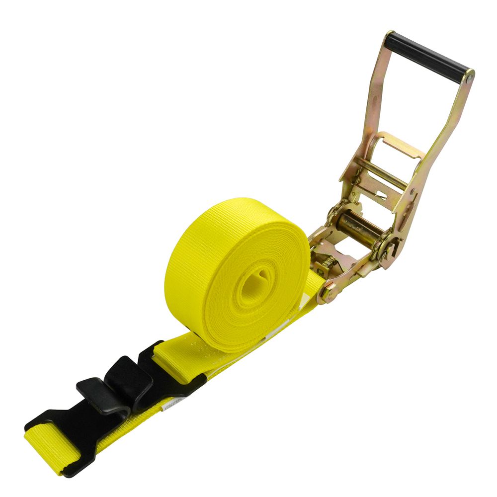 Treated with PVC throughout the strap's webbing, this ratchet strap can withstand small abrasions, cuts, elongation, and even UV rays throughout years of use. The 27 ft. long tie down can hold up to 2,000 lbs. with a 6,000 lbs. breaking point. The bright orange strap has a flat hook end fitting that is ideal for moving vans and flat bed trailer uses. The alterable ABS ratchet includes a specially designed long, wide handle for quick and easy adjustments.
