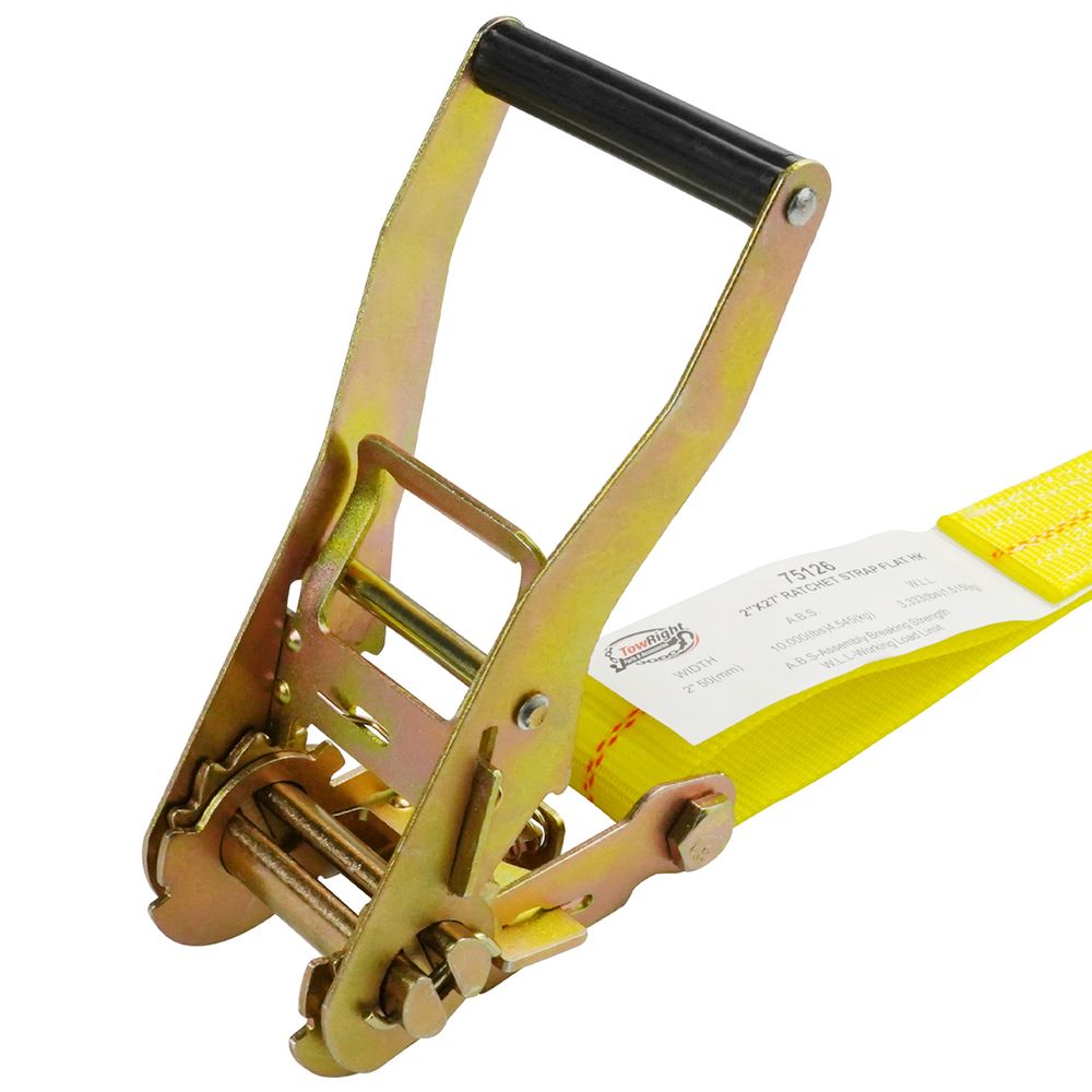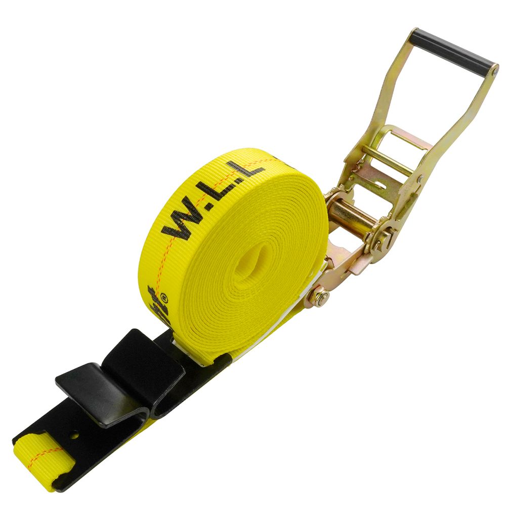 Ratchet straps are easy to use and give you added confidence when securing your cargo. This ratchet strap webbing is 2 inches wide by 27 feet long. The yellow webbing is weather resistant and has a working load limit of 3,335-lbs. and a breaking load limit of 10,000-lbs. It is not recommended to use this strap for cargo greater than the working load limit. The handle style ratchet provides grip and leverage for easy operation.