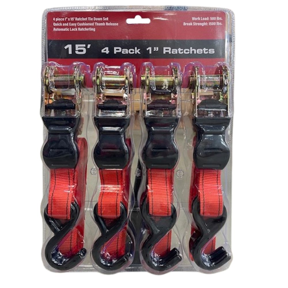 Ratchet Tie Down Set, 4 Pack, 15 Ft. x 1 In.