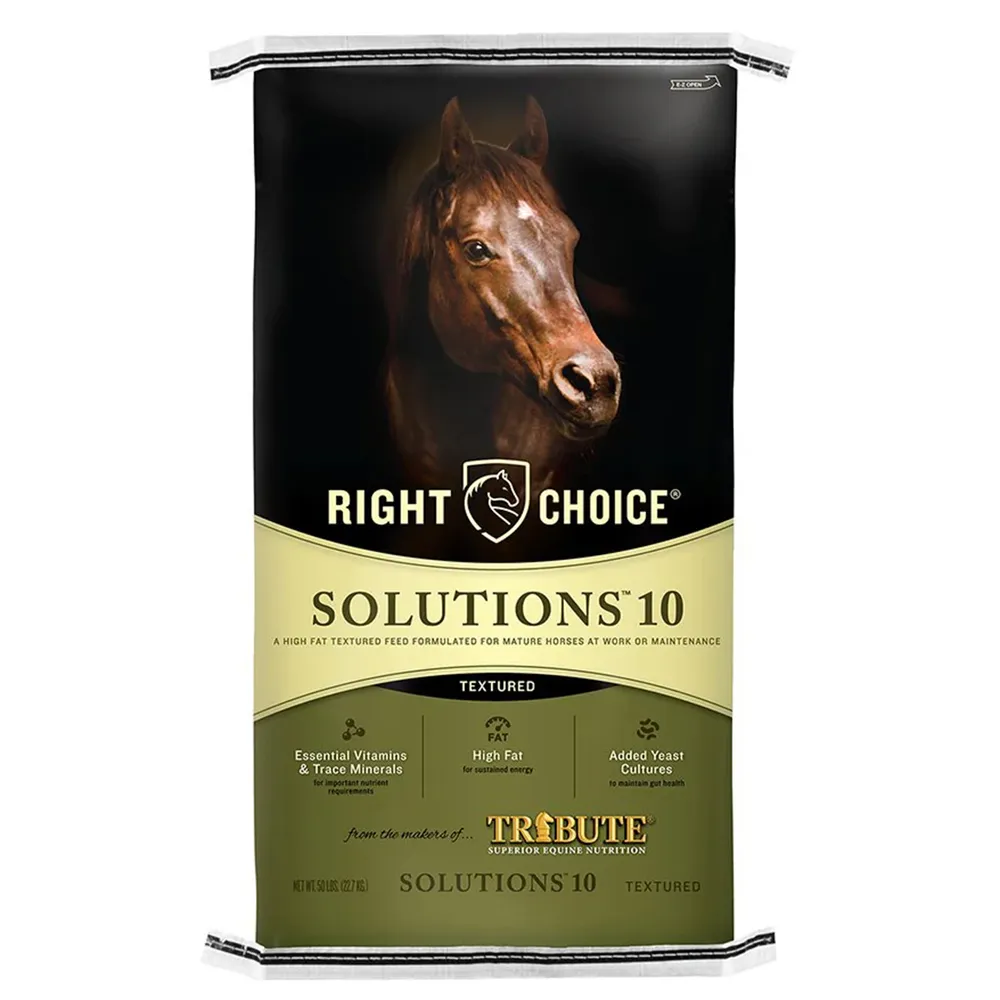 Kalmbach® Right Choice® Solutions 10 Textured for Mature Horses is a high fat feed formulated for mature horses at work or maintenance.