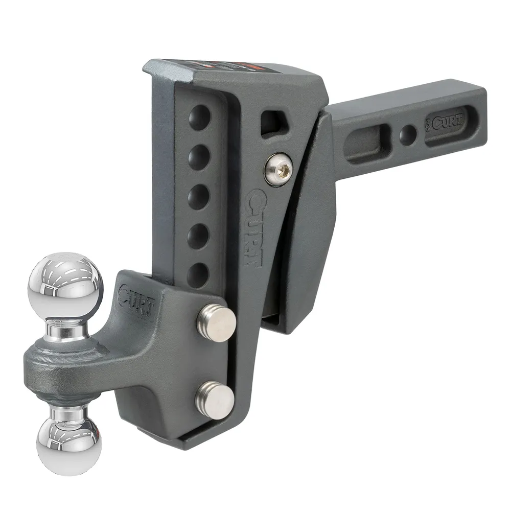 The Curt™ Rebellion XD Adjustable Cushion Hitch with 2 inch Shank fits 2 inch hitch receivers. This adjustable hitch protects the towing system from rattling, jerking and jarring and provides a more comfortable ride. The Rebellion XD hitch ball mount is made with ShockDrop technology. This includes a cushion isolator that rests between the horizontal receiver shank and the vertical ball mount. The dual ball can be adjusted up or down for a maximum drip of 6 inches.