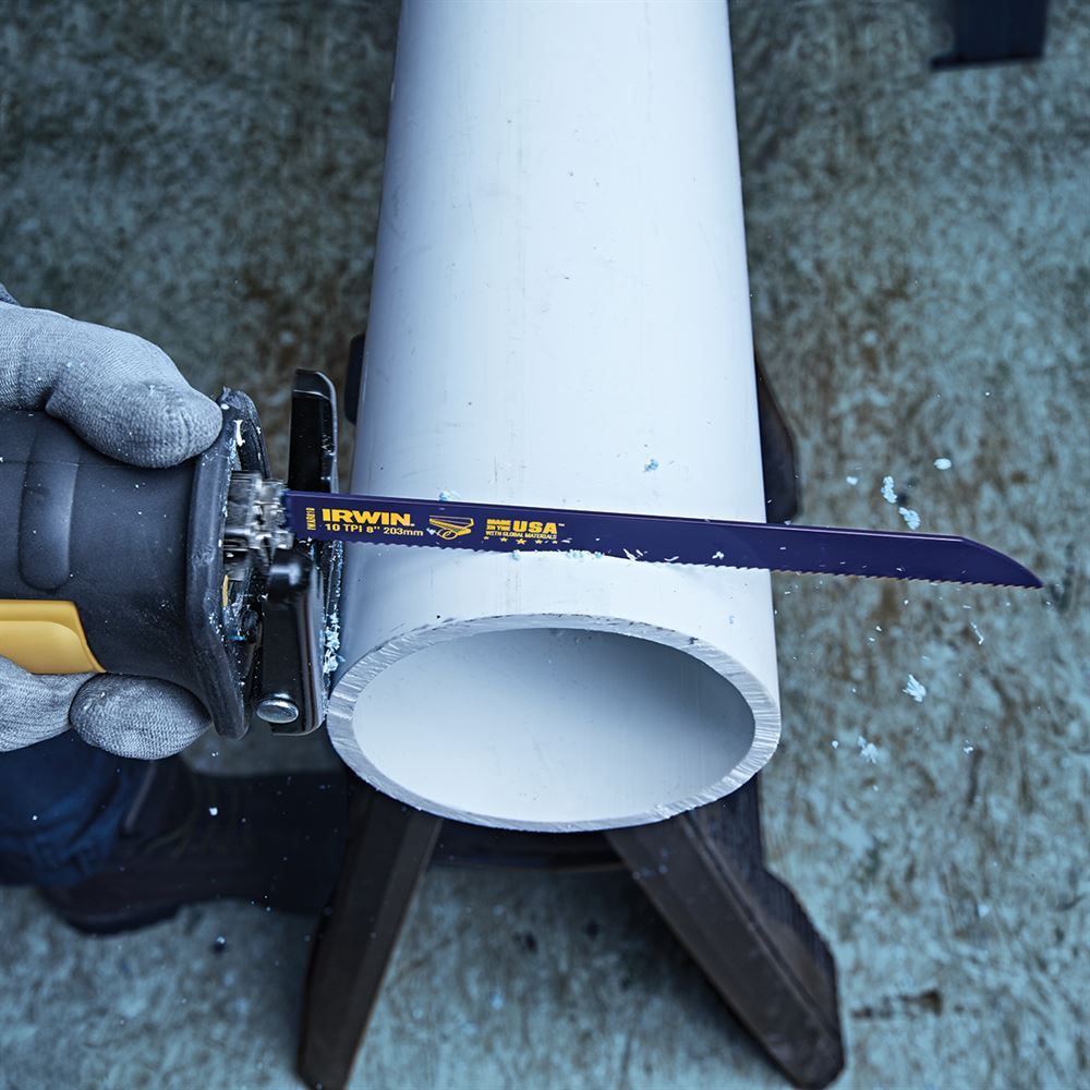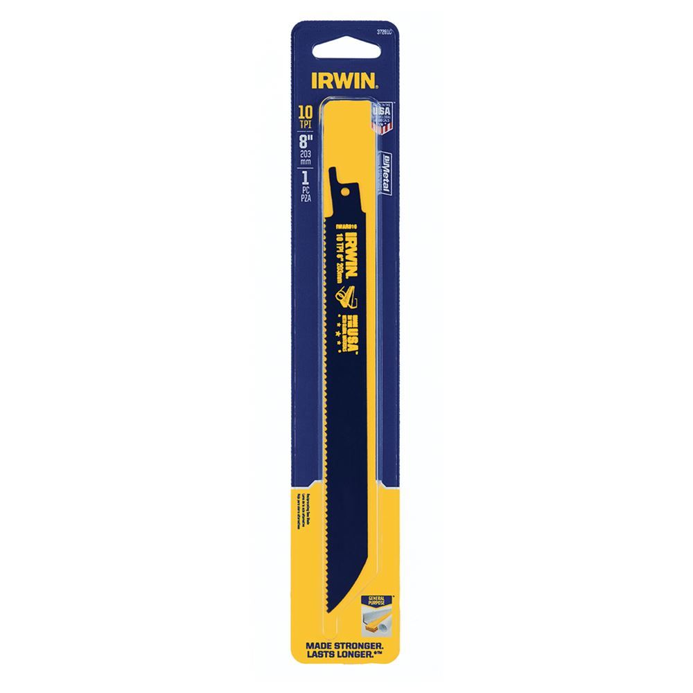 This reciprocating metal cutting saw blade is 8" in length and has 10 teeth per inch. It cuts composition materials, plastic, pipe, carbon steel, and stainless steel.