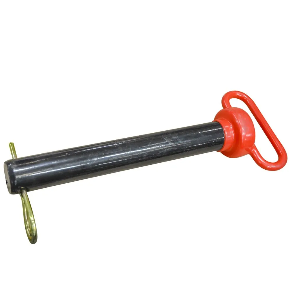 Hitch pin for tractors and 3-point implements. Our hitch pins are made of mild steel, and have a black powder coating with a red vinyl head and handle.