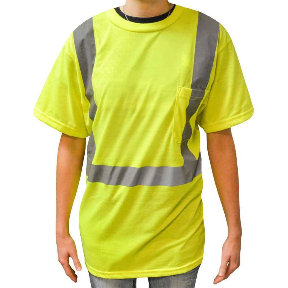 Safe yet comfortable to wear in outdoor working conditions this reflective T shirt lets highway workers be seen from a distance. The shirt is bright yellow with 2 in. reflective tape, one stripe is placed 360 degrees horizontally and 2 stripes are on the shoulders vertically. The material is 100 percent ANSI wicking spun polyester which helps keep away moisture, allowing the shirt wearer to remain dry. Pockets are a convenient feature, with one located on left chest pocket. This safety reflective shirt is an 2X but there are other sizes available from medium to 3X.