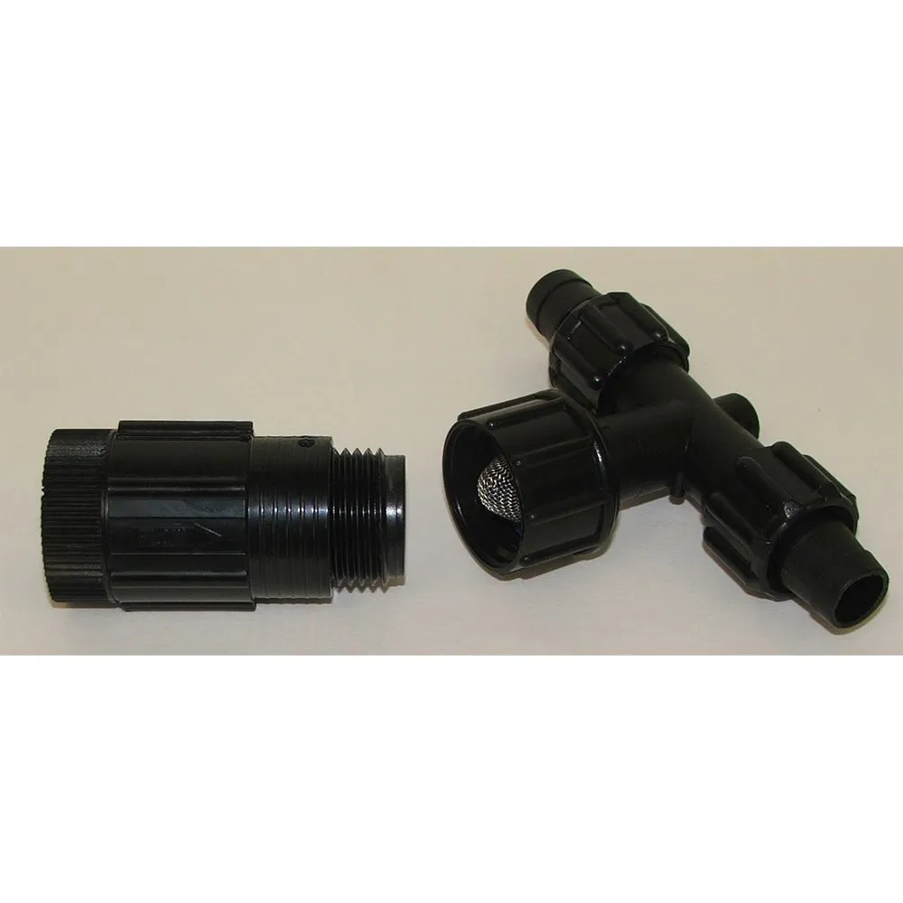 Regulator / Tee Screen Assembly connects drip tubing or distribution tubing to any 3/4-inch garden hose thread water source. The pressure regulator has a maximum operating pressure of 15 PSI.