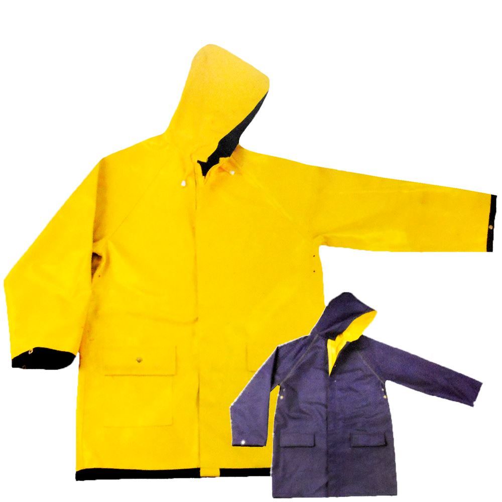 This reversible rain jacket is constructed from 100% waterproof polyester and PVC. A great article of clothing to wear when working outdoors in damp or wet weather conditions. This jacket has an attached drawstring hood and dual front pockets with snap closures. The exterior can either be yellow in color, or reversed to navy blue. This yellow rain jacket is a size large with additional sizes available.