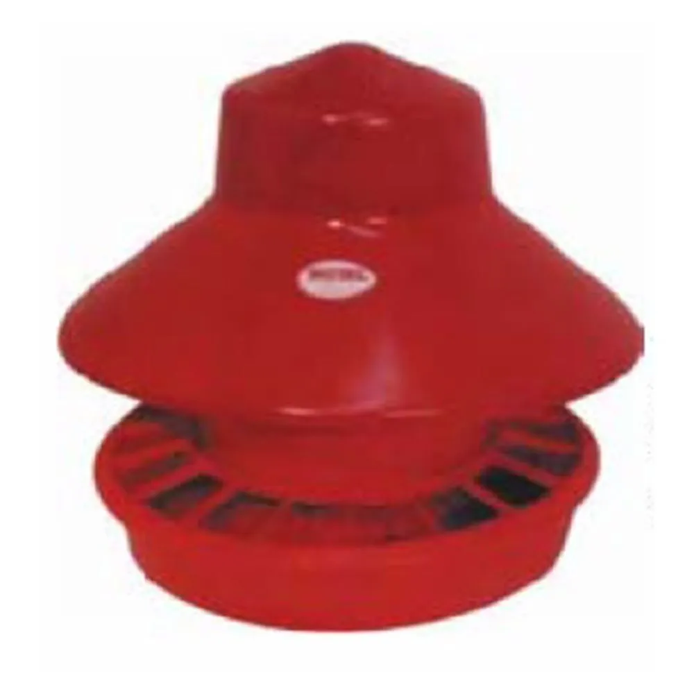 RF50 50-lb. range feeder with rain shield is 24” h. Pan is 4¾” d with a 22 ½” diameter. The RF50 has a feed saver grill.