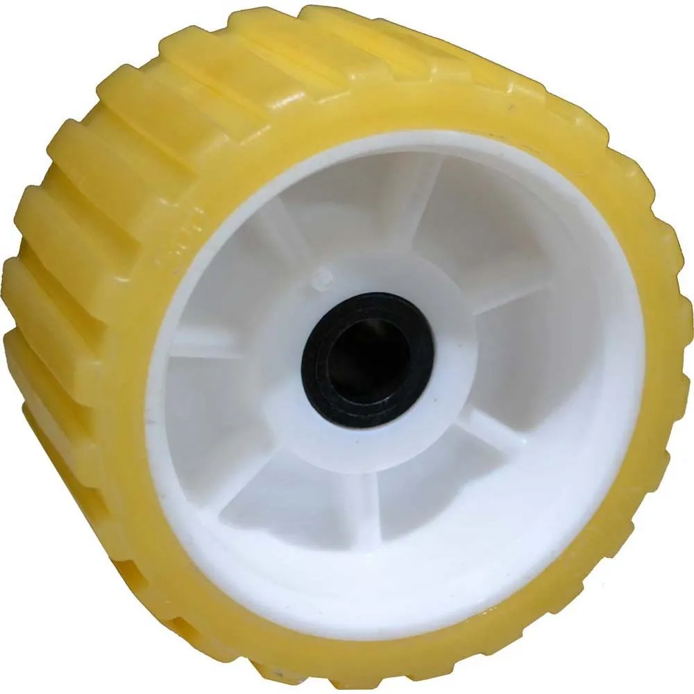 This 5" diameter yellow rib roller is made of thermoplastic rubber. It is resilient, non-marking, and stronger than rubber. It is is 5" in diameter, 3" wide and has a 5/8" shaft size.