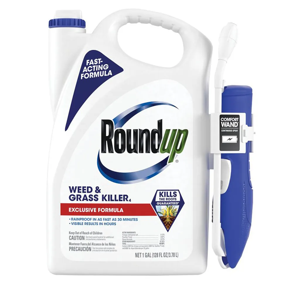 One-gallon container of Roundup Weed & Grass Killer is a non-selective herbicide containing glyphosate, a widely used chemical for controlling a broad spectrum of weeds and grasses.
