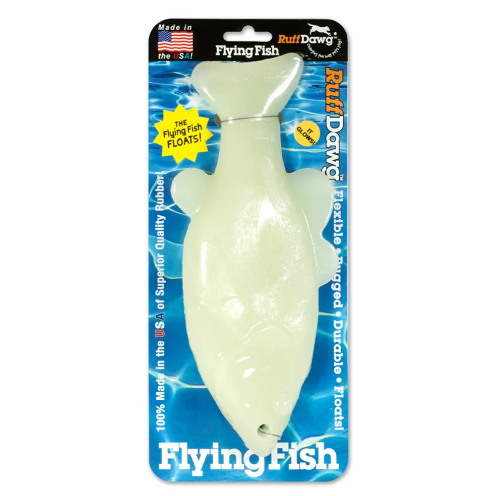 The RuffDawg™ Flying Fish Toy is made of durable rubber for play in or out of the water. It is scented and has bright neon colors. The RuffDawg™ Flying Fish Toy can be strung on a rope for tugging with your pet.